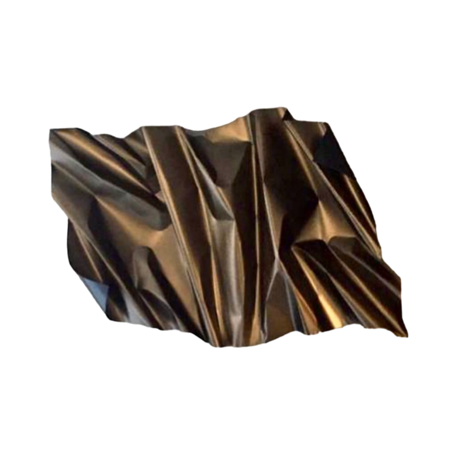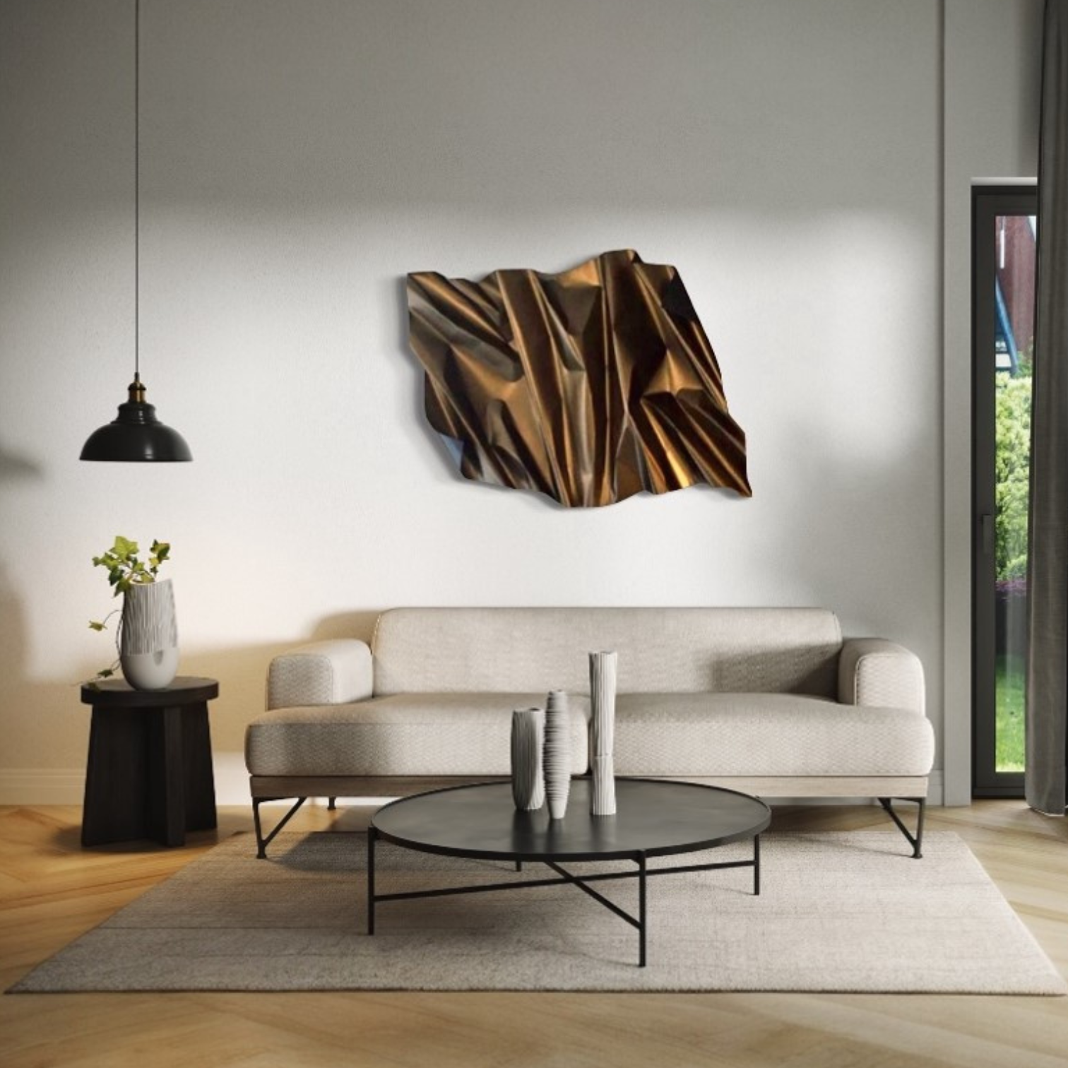Un torbellino de curvas y pliegues metálicos en tonos cobre, refleja luz y sombr, evocando la energía contenida en un instante de transformación perpetua.