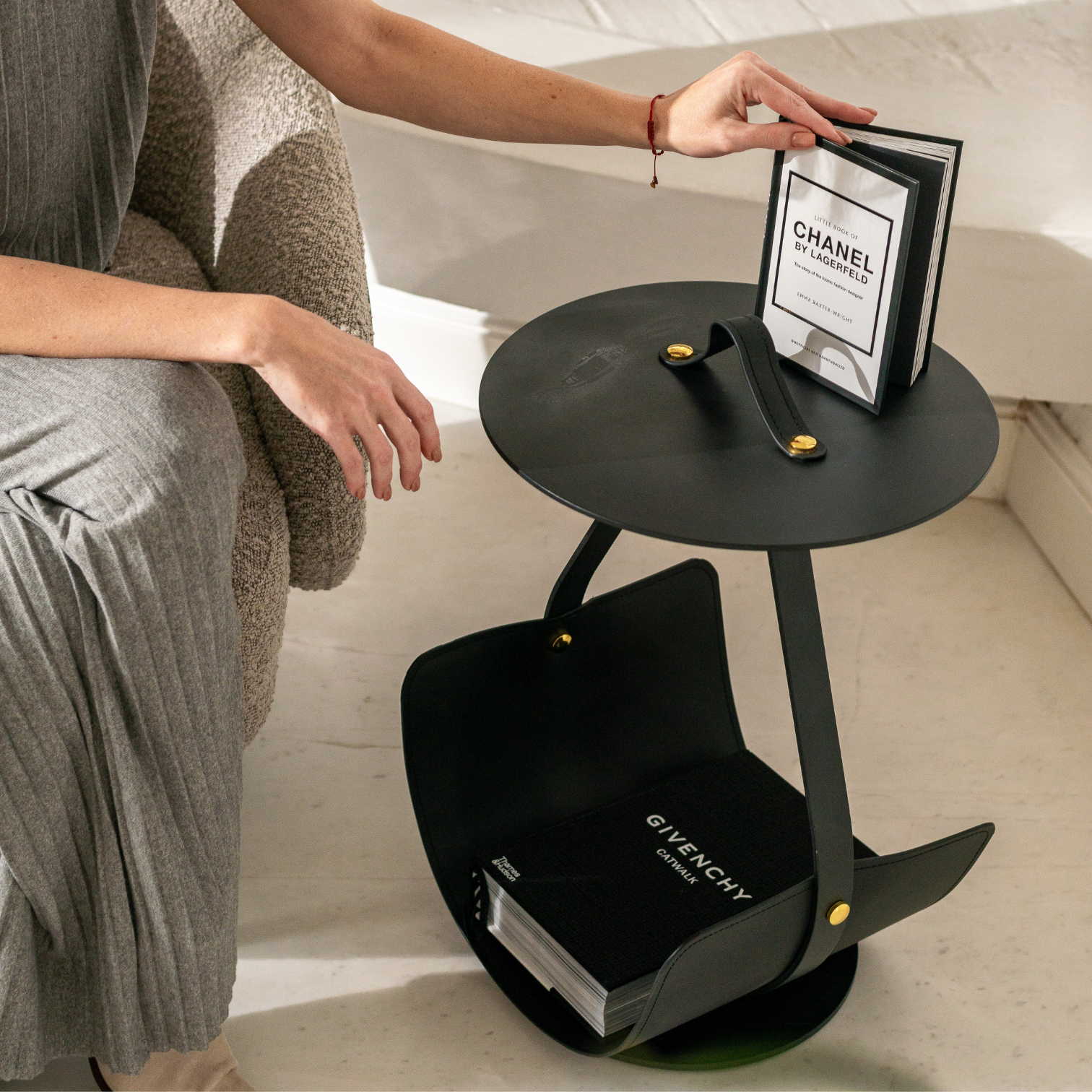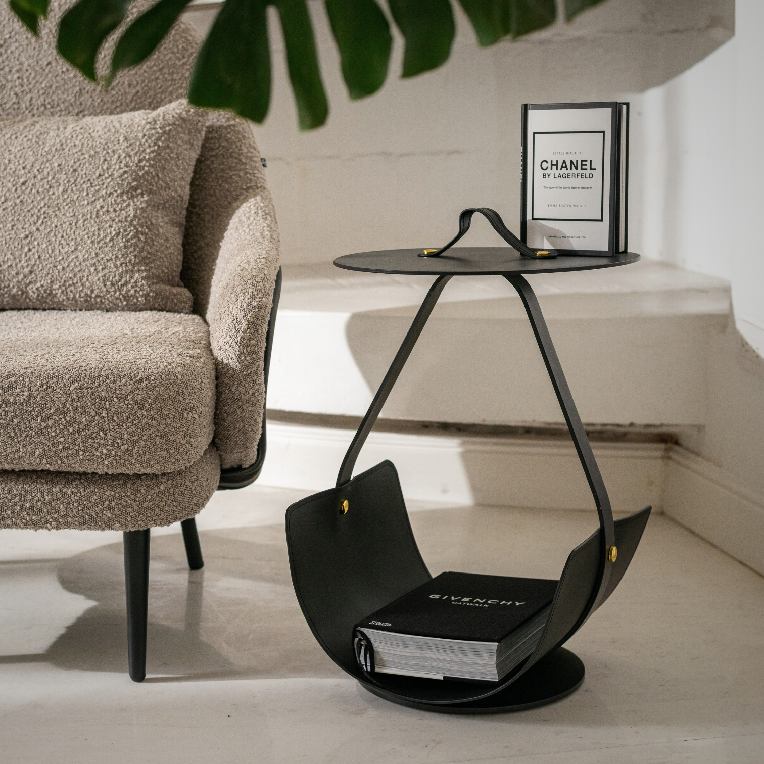 Destaca tu estilo con esta mesa auxiliar de diseño audaz y único. Su revestimiento de cuero genuino y compartimiento inferior para revistas la convierten en una pieza funcional y elegante. Perfecta para colocar junto a sofás, sillones o camas, aportando un toque original a tu decoración.