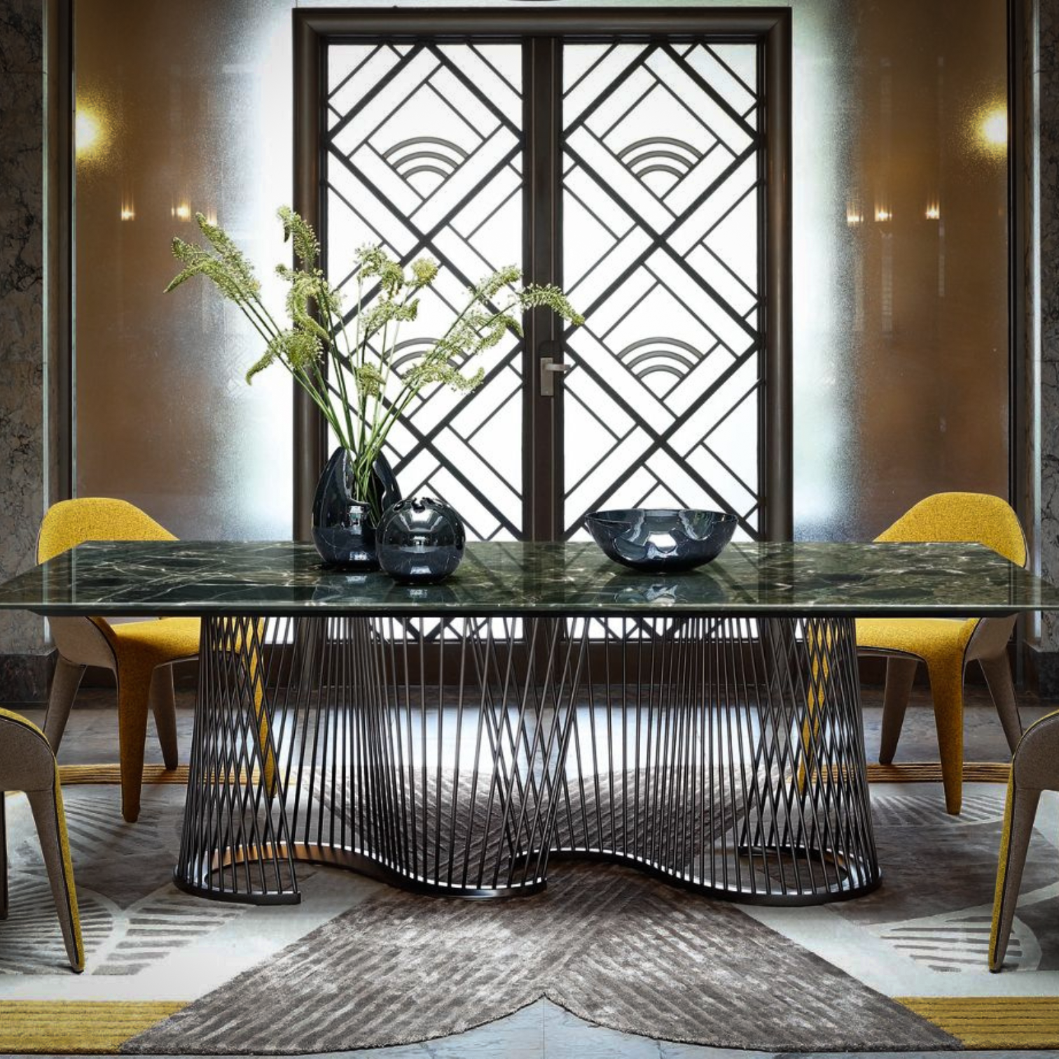 De base escultórica que ondula como arte, siendo un centro de reunión que irradia lujo contemporáneo.
