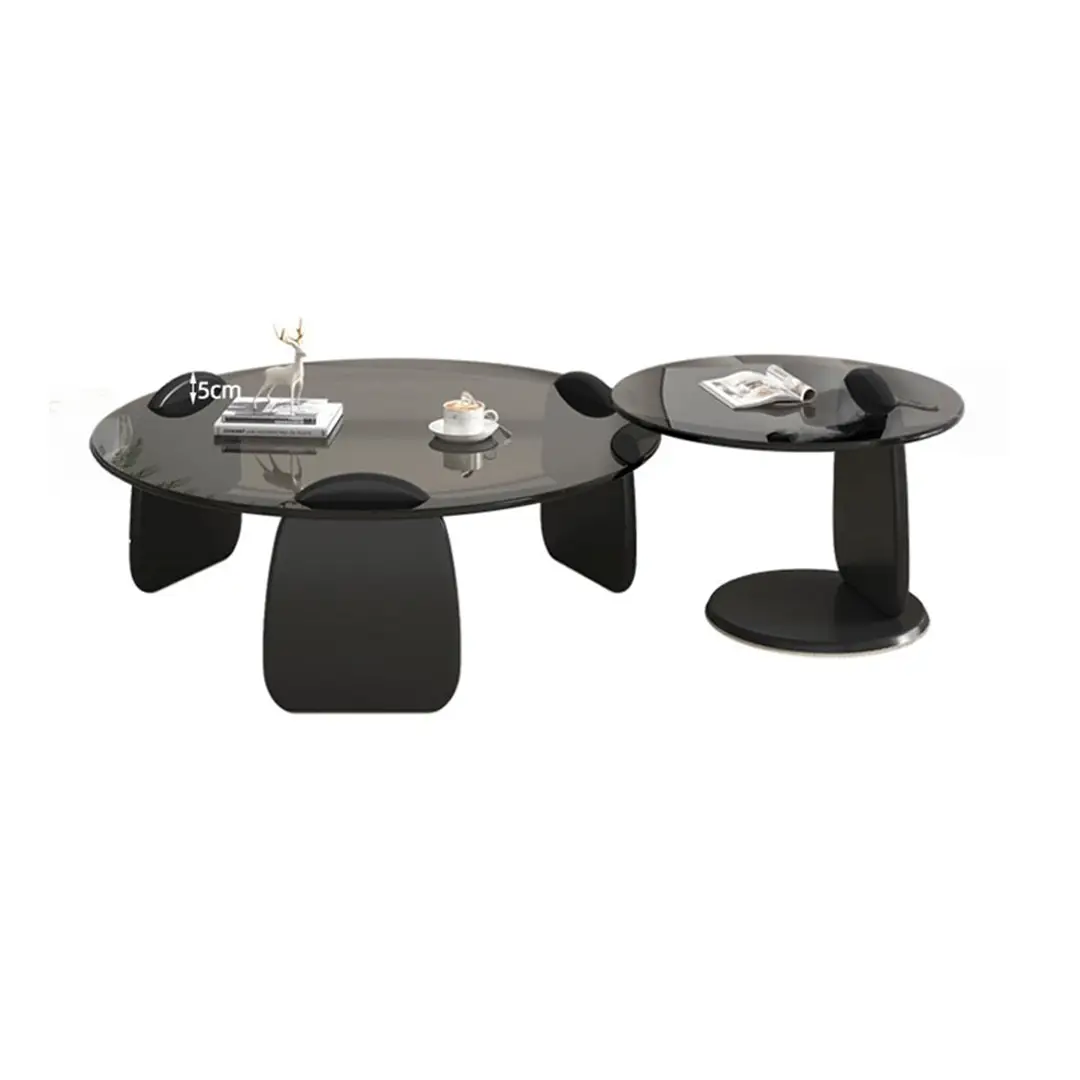 La combinación de materiales nobles como la madera y el vidrio en esta mesa de centro de formas curvas crea un contraste visual único en tu salón moderno.