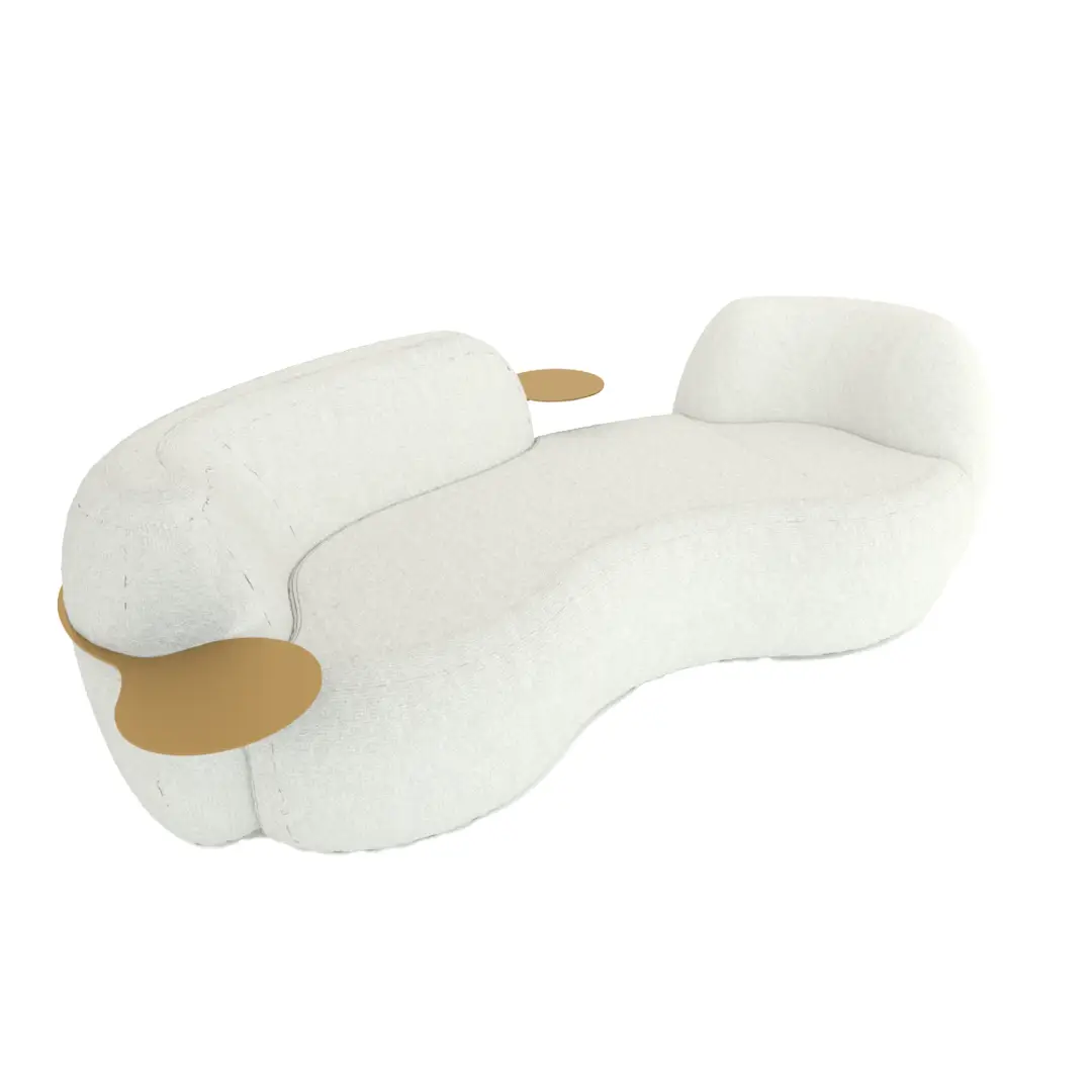 El sofá DREAM da rienda suelta a tu imaginación con su diseño audaz y curvilíneo. Sus formas voluptuosas te invitan a dejarte llevar por la comodidad y el estilo. Cuenta con una separación en el respaldo y mesas auxiliares incorporadas de latón dorado.